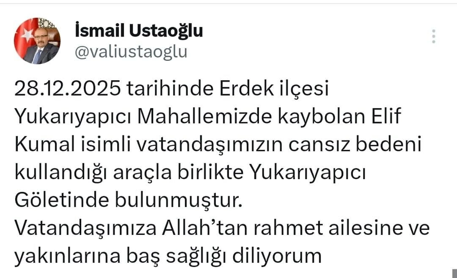 Acı gelişmeyi İsmail Ustaoğlu, sosyal medya hesabından yaptığı paylaşımla kamuoyuna duyurdu. Vali Ustaoğlu, Elif Kumal’ın cansız bedenine, yürütülen kapsamlı arama çalışmaları sonucu ulaşıldığını açıkladı.