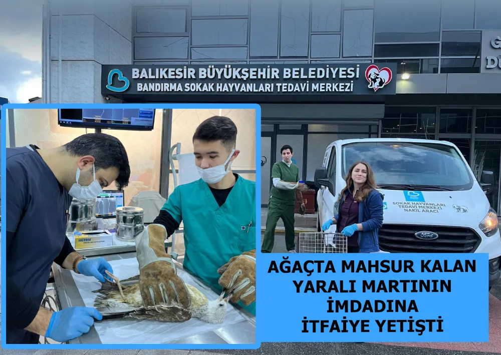 Balıkesir’in Bandırma ilçesine bağlı Paşabayır Mahallesi’nde ağaca takılı kalan yaralı martı, itfaiye ekipleri tarafından kurtarıldı. Balıkesir Büyükşehir Belediyesi Bandırma Sokak Hayvanları Tedavi Merkezi’nde tedavisine başlanan ve durumunun iyi olduğu öğrenilen martı, tedavisinin tamamlanmasının ardından doğal yaşamına bırakıldı.