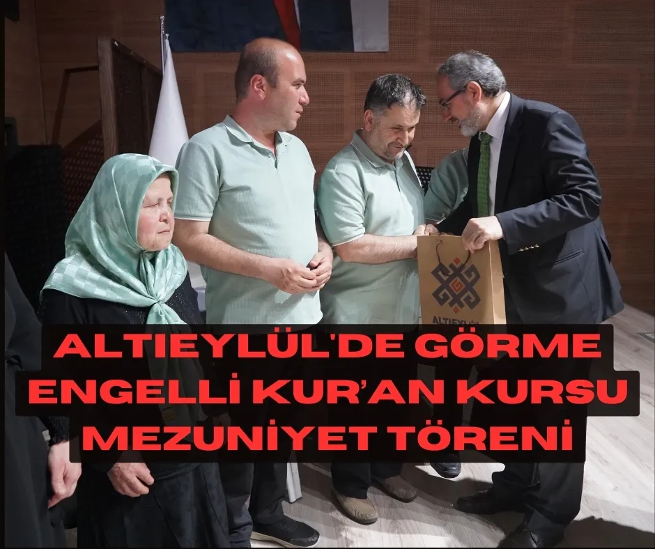 Altıeylül Belediyesi, görme engelli Kur'an kursunun dönem sonu programını çeşitli etkinliklerle tamamladı. Programa katılan Altıeylül Belediye Başkan Yardımcısı Mehmet Derdiman, engellerin sadece insanların kalbinde ve imanında olmaması gerektiğini vurguladı. Derdiman, "Kur'an-ı Kerim'i öğrenmek için büyük çaba gösteren tüm kardeşlerimize başarılar diliyorum. Onların gayreti takdire şayan. Bizler, üzerimize düşen her görevi yapmaya hazırız" dedi.