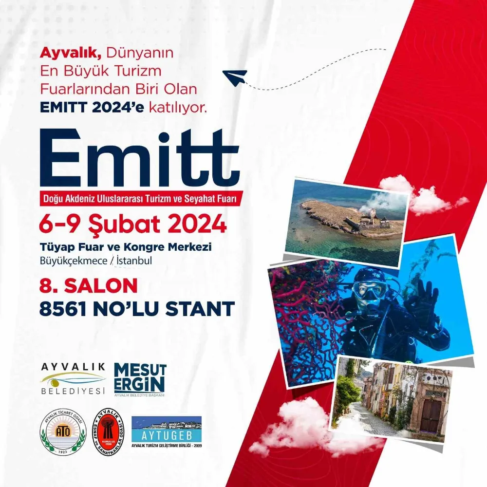 Ayvalık Belediyesi ve Doğu Akdeniz Uluslararası Turizm ve Seyahat Fuarı, İstanbul EMİTT’te bu yıl 6-9 Şubat tarihlerinde Ayvalık Ticaret Odası ve Turizm Geliştirme Birliği (AYTUGEB) ile birlikte 8. Salon 8561 numaralı stantta yerini alıyor.