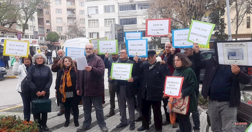 Açıklamaya katılanlar "Tavuk Adası kırmızı çizgimizdir", "Tabiat ve Kültür Varlıkları ranta açılamaz", "Kıyılar halkındır", "Restorasyon bahane, rant şahane", "Turizme evet, doğal ve tarihsel yıkıma hayır", "Müze bahane, rant şahane" yazılı dövizler açtı.
