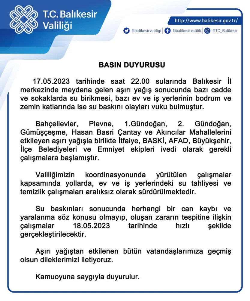 "17.05.2023 tarihinde saat 22.00 sularında Balıkesir İl merkezinde meydana gelen aşırı yağış sonucunda bazı cadde ve sokaklarda su birikmesi, bazı ev ve iş yerlerinin bodrum ve zemin katlarında ise su baskını olayları vuku bulmuştur.