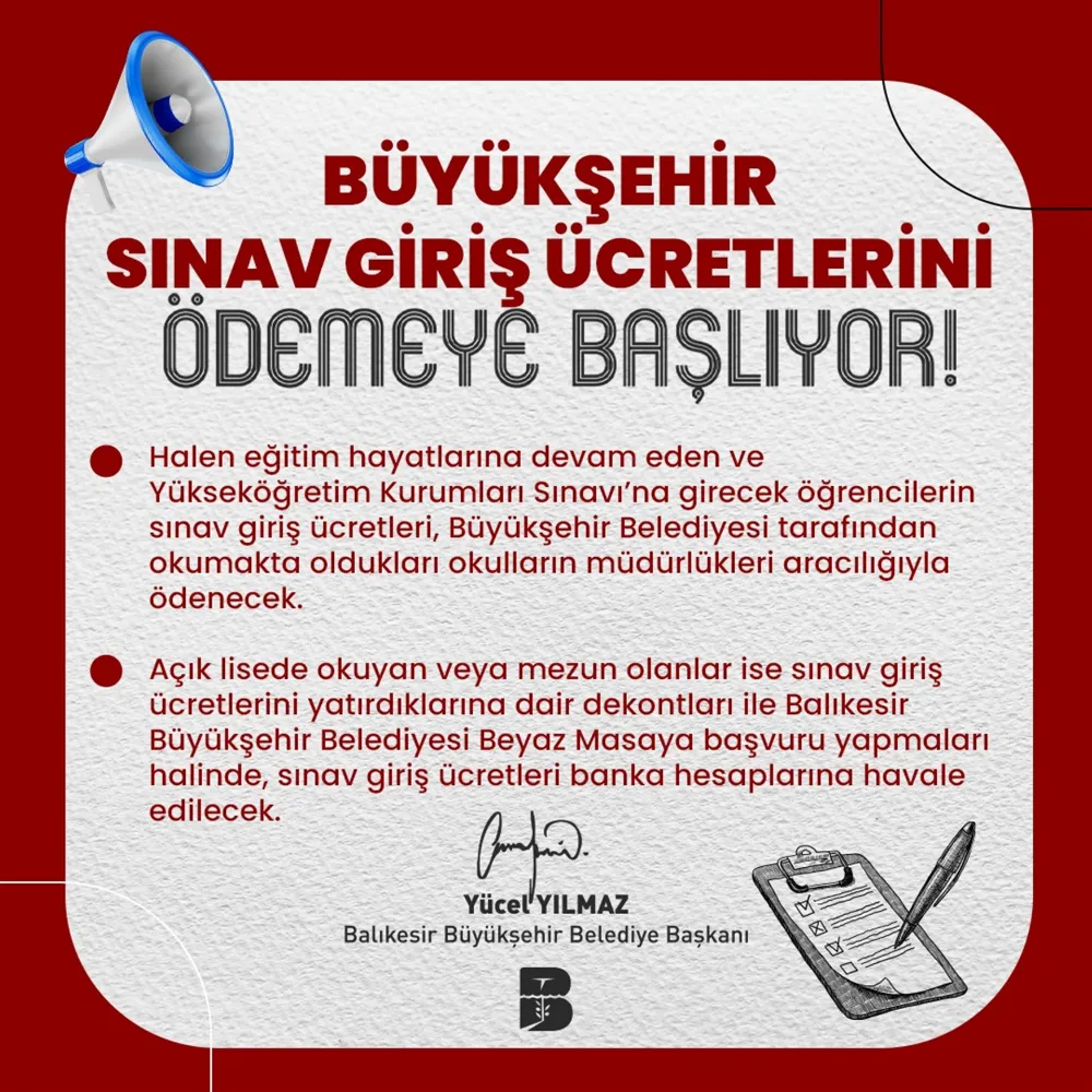 Gençler için onlarca projeye imza atan Balıkesir Büyükşehir Belediye Başkanı Yücel Yılmaz verdiği sözleri bir bir tutuyor. Dijital Gençlik Merkezi (DGM), Balbucks, öğrenciye ücretsiz su, öğrenciye vize ve final haftalarında ücretsiz ulaşım, gençlik merkezleri, kütüphaneler gibi onlarca projeyi hayata geçiriyor. Yine söz verdiği gibi üniversite sınavına girecek olan öğrencilerin sınav giriş ücretlerini ödemeye başlıyor.