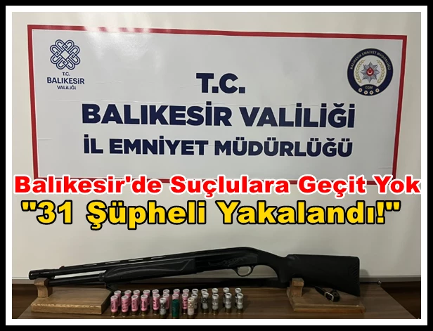 Edinilen bilgiye göre, Balıkesir İl Emniyet Müdürlüğü Asayiş Şube Müdürlüğü, Altıeylül, Karesi, Bandırma, Burhaniye, Edremit, Erdek, Havran, Marmara ve Susurluk ilçelerinde eş zamanlı operasyon düzenledi. Operasyonda, çeşitli suçlardan aranan 31 şüpheli yakalandı. Yakalanan şüphelilerden 17'si tutuklanarak cezaevine gönderildi.