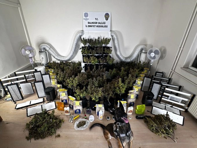 Narkotik Suçlarla Mücadele Şube Müdürlüğü ekipleri, Bandırma'da bir adreste uyuşturucu madde ekimi ve üretimi yapıldığı bilgisi üzerine harekete geçti. Ekipler, belirlenen adrese operasyon düzenledi. Operasyonda, 55 kök ekili uyuşturucu skunk esrar maddesi, 4 kilo 171 gram daralı skunk esrar maddesi, 20 adet led iklimlendirme cihazı, 24 paket ortam nem çekici, 7 adet ortam ısı ve nem ölçme cihazı, 5 adet sıvı kimyasal, 3 adet elektronik pH ölçme cihazı, 3 adet ortam nemlendirme cihazı, 3 adet vantilatör, 2 adet havalandırma cihazı, 2 paket katı kimyasal, 1 adet vakum makinesi, 1 adet hassas terazi ve 1 adet esrar maddesi öğütücü aparat ele geçirildi.