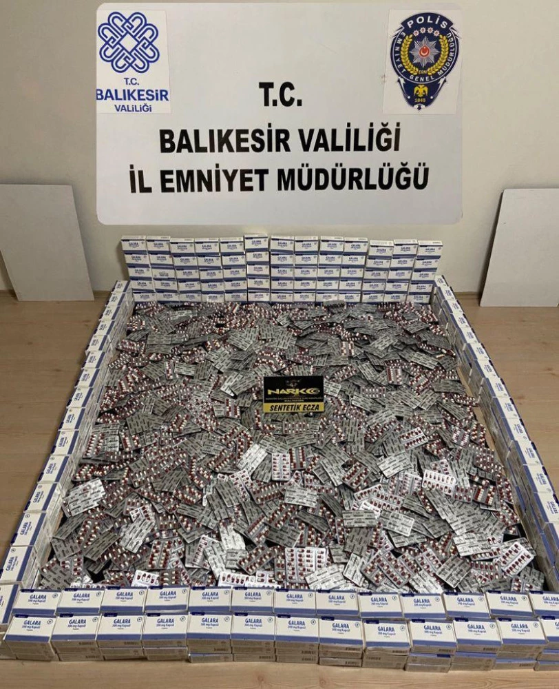 239 kutu 13384 adet Sentetik Ecza Hap ele geçirildi.Konuyla ilgili yakalanan 2 şahsa Uyuşturucu veya Uyarıcı Madde İmal veya Ticareti Yapmak suçundan adli tahkikata başlanıldı,şahıslar GÖZALTINA alındı.