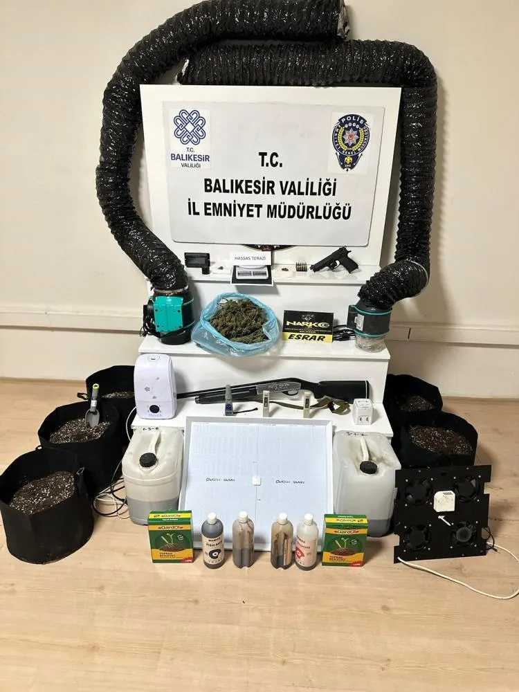 Balıkesir İl Emniyet Müdürlüğü Narkotik Suçlarla Mücadele ekipleri bugün il merkezinde bulunan bir adrese operasyon düzenledi. Operasyonda; 336 gram esrar, 1 adet çalışır vaziyette hassas terazi, 1 adet uyuşturucu madde ekimi için kullanılan çadır ve çadıra ait ekipman, 1 adet esrar öğütme aparatı, 1 adet led panel aydınlatma, 6 paket sıvı halde bitki takviye sıvısı, 2 paket bitki takviye toprağı, 3 adet PH ölçer, 1 adet nem ölçer ve 5 adet saksı, 3 adet vantilatör, 1 adet sulama sistemi cihazı, 1 adet kurusıkı tabanca ve tabancaya ait 13 adet fişek, 1 adet ruhsatsız av tüfeği, uyuşturucu madde ticaretinden elde edildiği değerlendirilen 8 bin 540 lira para ele geçirildi. Yapılan operasyonda uyuşturucu madde imal ve ticareti yapma suçundan bir şahıs gözaltına alındı.