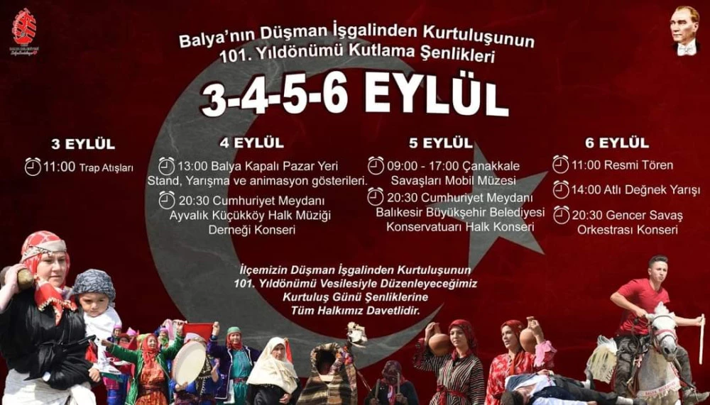 Balya'nın kurtuluş günü olan 6 Eylül'de saat 11.00'de resmi tören, 14.00'de Atlı Değnek Yarışı gerçekleştirilecek. Etkinlikler saat 20.30'da Gencer Savaş Orkestrası konseri ile sona erecek.