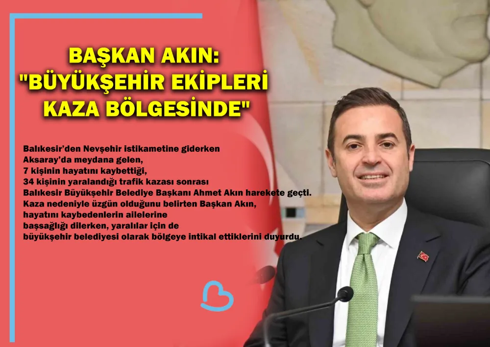 Balıkesir’den Nevşehir istikametine giderken Aksaray’da meydana gelen, 7 kişinin hayatını kaybettiği, 34 kişinin yaralandığı trafik kazası sonrası Balıkesir Büyükşehir Belediye Başkanı Ahmet Akın harekete geçti. Kaza nedeniyle üzgün olduğunu belirten Başkan Akın, hayatını kaybedenlerin ailelerine başsağlığı dilerken, yaralılar için de büyükşehir belediyesi olarak bölgeye intikal ettiklerini duyurdu.