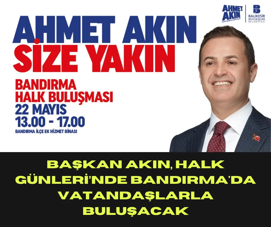 22 Mayıs Çarşamba günü, 13.00-17.00 saatleri arasında Bandırma Ek Hizmet Binası'nda gerçekleştirilecek olan bu buluşma, Başkan Akın’ın vatandaşların sorunlarını, isteklerini ve taleplerini dinlemesine olanak sağlayacak.