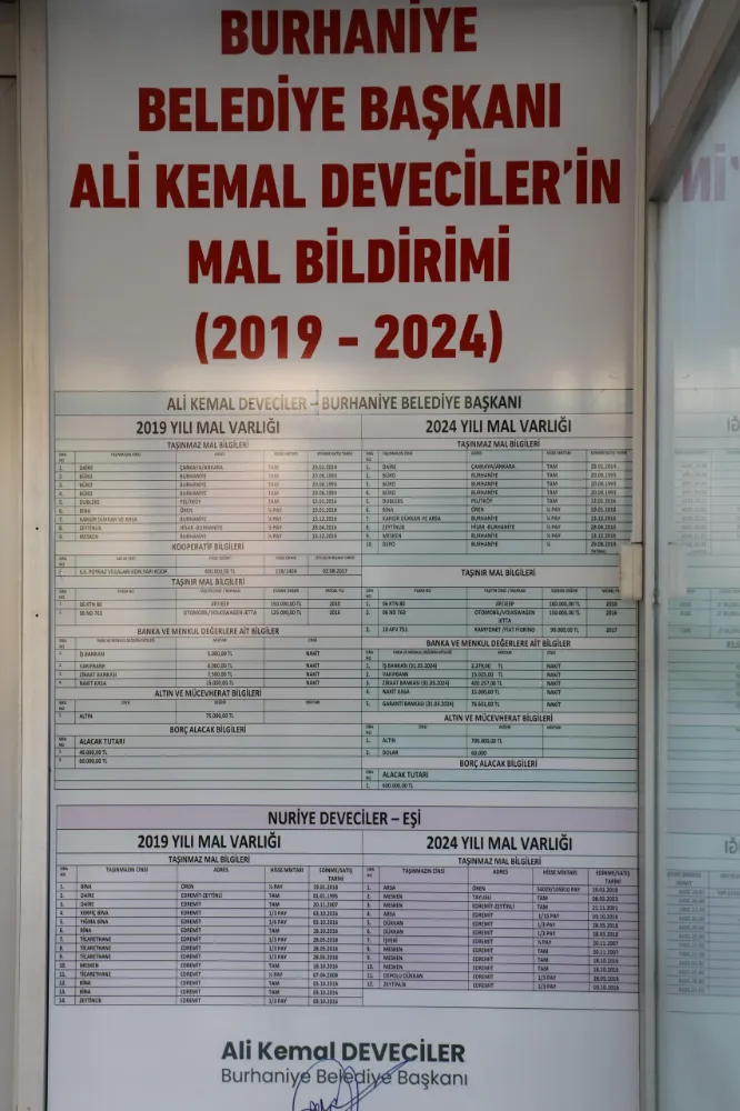 31 Mart Yerel Seçimlerinde Burhaniyeliler tarafından bir dönem daha belediye başkanlık görevine seçilen Burhaniye Belediye Başkanı Ali Kemal Deveciler, 2019 ve 2024 yıllarına ait mal beyanını belediye hizmet binasının giriş kapısına astı.