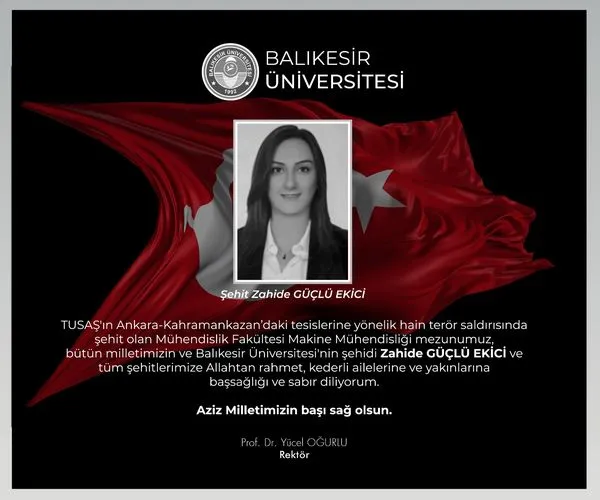 Ankara – Kahramankazan'da bulunan Türk Havacılık ve Uzay Sanayii A.Ş. (TUSAŞ) tesislerine yönelik terör saldırılarında can kayıpları arasında, Balıkesir Üniversitesi'nin gururu ve Mühendislik Fakültesi Makine Mühendisliği mezunu Zahide Güçlü Ekici de yer aldı.