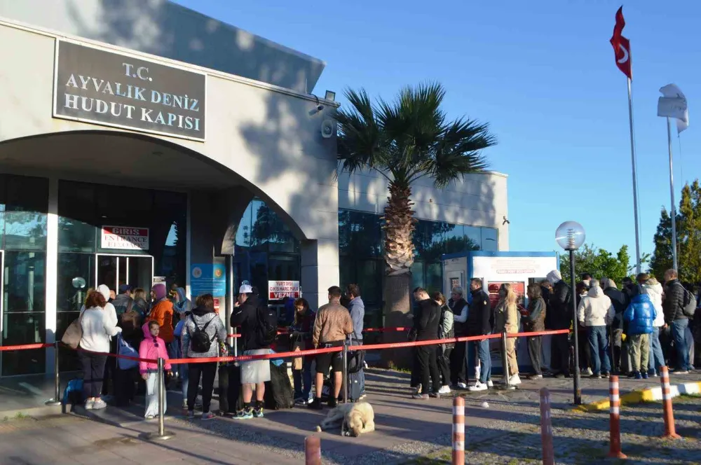 Günün ilk seferi ile tura çıkmak isteyen vatandaşlar uzun Ayvalık Deniz Hudut Kapısı önünde uzun kuyruklar oluşturdu.