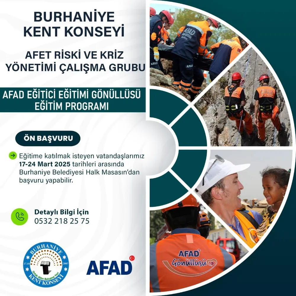 Afetlere karşı bilinçli ve eğitimli gönüllüler yetiştirmeyi amaçlayan program kapsamında, AFAD uzmanları tarafından katılımcılara eğitim verilecek. Programa başvurular 17-24 Mart 2025 tarihleri arasında alınacaktır. Katılmak isteyen vatandaşlar, Burhaniye Belediyesi Halk Masası’na başvuruda bulunabilir.