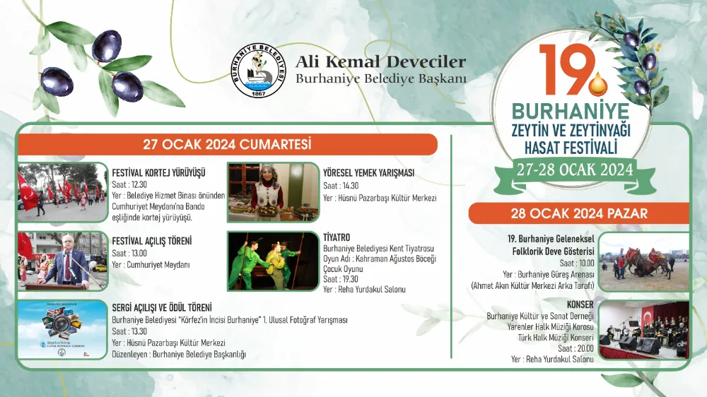 Herkesi festivale davet eden Başkan Deveciler, “Bu toprakların en önemli değeri zeytin ve zeytinyağını, bu yıl 19.sunu düzenleyeceğimiz festivalimiz ile bir kez daha vurgulayacağız. Zeytinyağlı yöresel yemeklerimizin yarışacağı yarışmada mutfak kültürümüzü tazelerken, memleketimizin güzelliklerinin ölümsüzleştirildiği fotoğraf yarışmasının kazananları ödüllerini alacak ve fotoğraf sergimiz halkımızın beğenisine sunulacak. Asırlık kültürü olan ve yüzlerce insanın büyük bir heyecanla beklediği güreşler için de ülkemizin dört bir yanından pek çok deve ve sahipleri ile güreşseverler Burhaniye’de buluşacak. Tiyatro ve konser ile her yaş grubuna hitap eden festivalimize tüm halkımızı davet ediyoruz” dedi.