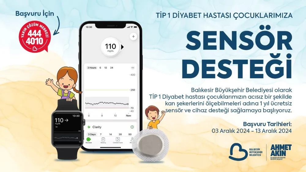 Türkiye’de her yıl yüzlerce çocuğa tip 1 diyabet tanısı konuluyor. Hastaların hayatını kolaylaştıran diyabet sensörü sayesinde çocuğun vücuduna takılan sistem kan şekerini acısız bir şekilde ölçüyor. Sensör sistemi ile çocukların kan şekeri ölçülürken parmakları delinmeden, canları acımadan 5 dakikada, kandaki glikoz seviyesi takip edilebilecek. Çocukların ve ailelerin hayatını kolaylaştıracak olan sensör sayesinde Balıkesir Büyükşehir Belediyesi, aileleri yıllık ortalama 26 bin TL maliyetten kurtararak omuzlarındaki yükü sırtlanıyor.