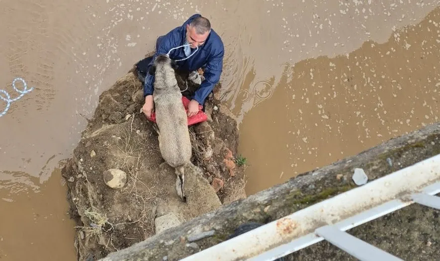 Balıkesir Büyükşehir Belediyesi İtfaiye ekipleri, tehlikeye rağmen suyun içine girerek girerek can dostunu kurtardı. Çevre sakinleri, suyun yükselmesi ile hayvanın telef olacağını köpeğin hayatını kurtardıkları için itfaiye ekiplerine teşekkür ettiler.