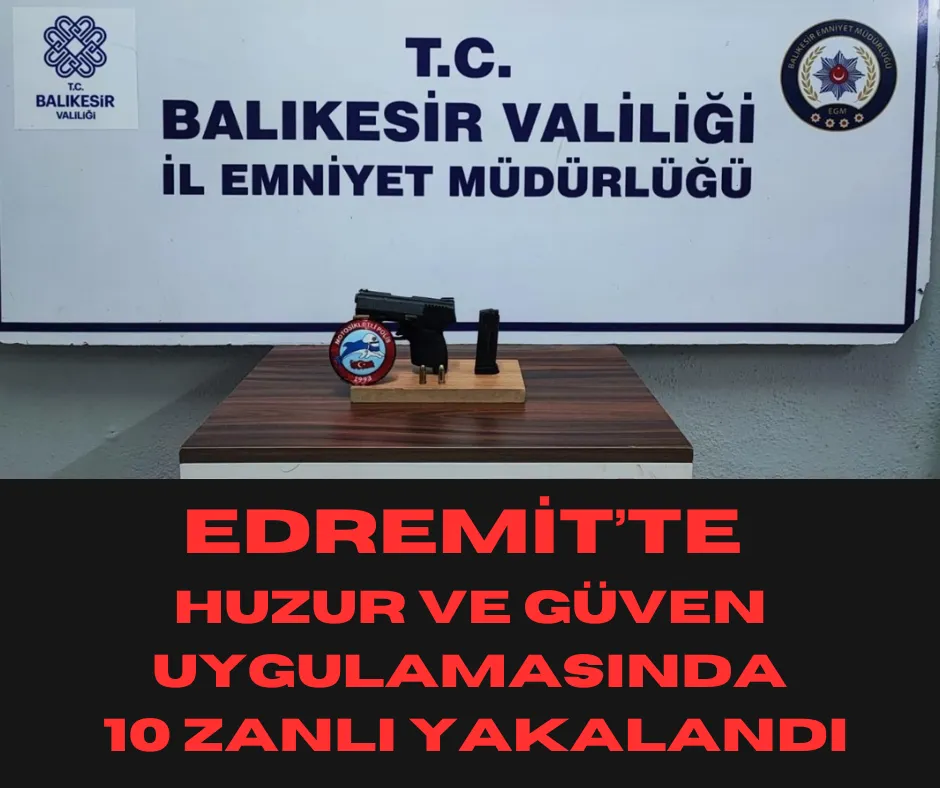 Balıkesir'in Edremit ilçesinde Emniyet Müdürlüğü ekipleri tarafından düzenlenen huzur ve güven uygulamasında çeşitli suçlardan aranan 10 zanlı yakalandı.