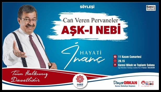 Karesi Belediyesi kültüre ve sanat etkinliklerine bir yenisini daha ekliyor. Yazar Hayati İnanç, Karesililerle buluşacak. Mizahi anlatımı ile güldürürken düşündüren, keyifli sohbeti ile gönüllere dokunan Hukukçu, Araştırmacı ve Eğitimci Yazar Hayati İnanç, “Can Veren Pervaneler Aşk-ı Nebi” söyleşisi ile sevenleriyle bir araya gelecek.