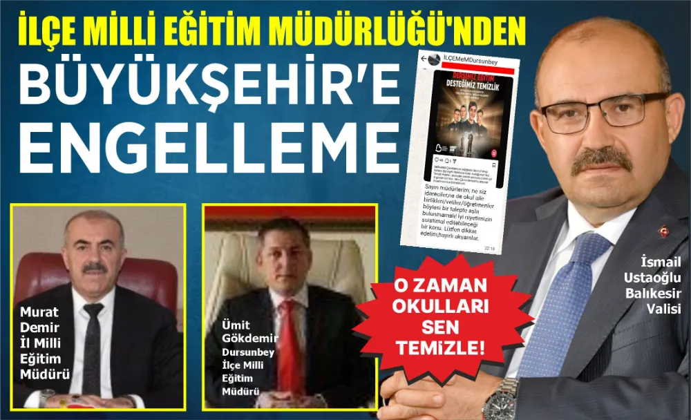 Balıkesir Büyükşehir Belediyesi tarafından öğrencilere yapılmak istenen desteğe Dursunbey İlçe Milli Eğitim Müdürü engel olmak için seferber oldu. Dursunbey İlçe Milli Eğitim Müdürü Ümit Gökdemir, whatsapp gruplarından okul müdürlerine ve velilere attığı mesajda Büyükşehir’den destek İSTEMEYİN dedi.