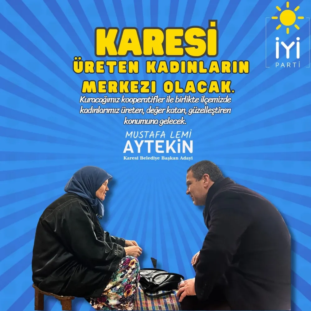 Karesi ilçesinde yerel ekonominin güçlenmesi ve toplumsal kalkınmanın desteklenmesi için önemli bir adım atılıyor.İYİ Parti'nin Karesi Belediye Başkan adayı Mustafa Lemi Aytekin, kadın kooperatiflerinin kurulmasıyla ilçenin değerine değer katacağını vurguladı.