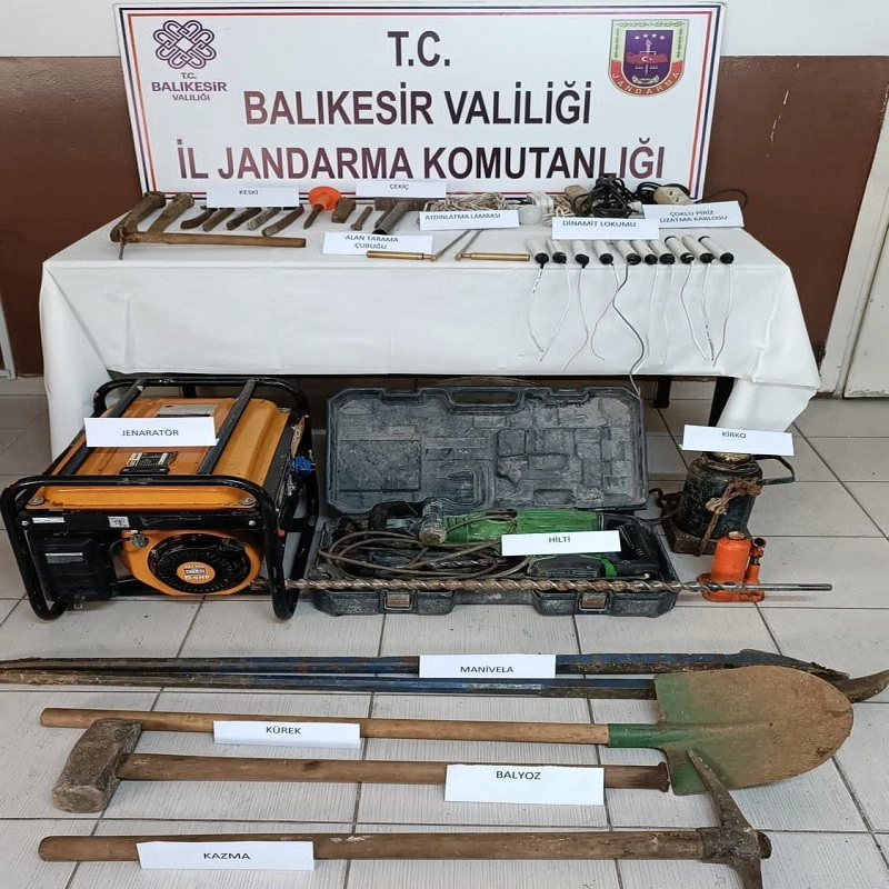 Balıkesir İl Jandarma Komutanlığınca, kültür ve tabiat varlıkları kaçakçılığına yönelik yapılan istihbari çalışmalar neticesinde, Erdek ilçesi kırsalında patlayıcı madde kullanmak suretiyle izinsiz kazı yapılacağının tespiti üzerine bölgede yapılan kontroller neticesinde (7) şüpheli izinsiz kazı yaparken suçüstü yakalandı.Şüpheliler ile birlikte (10) adet patlayıcı madde, (1) adet jeneratör, (1) adet hilti ve (25) adet kazı malzemesi ele geçirildi.Olayla ilgili (7) şüpheli yakalandı.