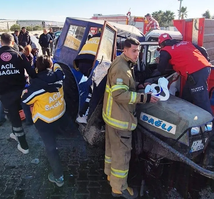 Kaza, Ayvalık ilçesi 150 Evler Mahallesi önünde meydana geldi. Edinilen bilgiye göre, 17 KT 036 plakalı zeytin işçilerini taşıyan traktör ile 34 YP 4634 plakalı kamyonet kafa kafaya çarpıştı. Kazaya, Balıkesir İtfaiyesi Ayvalık Grup Amirliği, sağlık ve polis ekipleri müdahale etti. Kamyon sürücüsü A.T., sıkıştığı yerden itfaiye ekipleri tarafından çıkartılırken zeytin işçilerinden L.D., K.K. ve H.A. yaralandı.