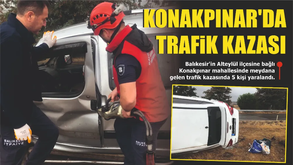 Balıkesir İzmir yolu Konakpınar kavşağında hafif ticari araçla otomobil çarpıştı. Çarpmanın etkisiyle binek otomobil yolun kenarına savruldu. Binek araç içerisinde bulunan H.A. G.A. M.A. ve E.A’nın kendi imkanlarıyla araçtan kurtulduğu öğrenildi. Hafif ticari araçta sıkışan İ.D. ihbar üzerine olay yerine intikal eden itfaiye ekipleri tarafından uzun uğraşlar sonucunda kurtarıldı. Yaralı vatandaşlar sağlık ekiplerine teslim edildi. Kazada can kaybı yaşanmazken araçlarda maddi hasar meydana geldi. Olayla ilgili inceleme başlatıldı.