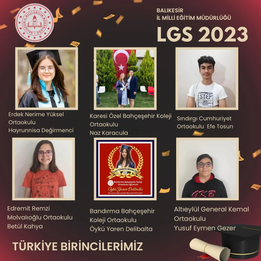 Balıkesir’i gururlandıran Altıeylül Genaral Kemal Ortaokulu öğrencisi Yusuf Eymen Sezer, Bandırma Özel Bahçeşehir Ortaokulu öğrencisi Öykü Yaren Delibalta, Edremit Remzi Molvalıoğlu Ortaokulu öğrencisi Betül Kahya, Erdek Nerime Yüksel Ortaokulu öğrencisi Hayrünnisa Değirmenci, Karesi Özel Bahçeşehir Ortaokulu öğrencisi Naz Karacula, Sındırgı Cumhuriyet Ortaokulu öğrencisi Efe Tosun LGS'de 500 tam puan alarak Türkiye şampiyonlarının arasına girdi.