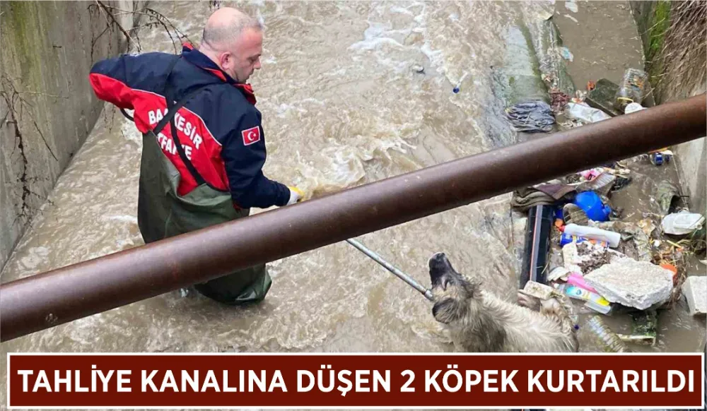 Balıkesir’in Manyas ilçesinde, su dolu bir tahliye kanalına düşen iki çoban köpeği, itfaiye ekiplerinin yoğun çalışması sonucu kurtarıldı.
