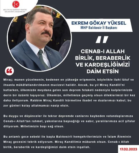 "Bu yıl Miraç Kandili'ni kutlarken, ülkemizde meydana gelen son deprem felaketi nedeniyle kalplerimizde derin bir üzüntü taşıyoruz.