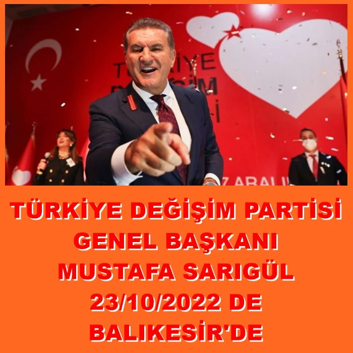 Tdp genel Başkanı Mustafa Sarıgül " class="text-dark font-weight-bold" target="_blank"> Mustafa Sarıgül 23 Ekim pazar günü saat 14:00 Balıkesir'de bir dizi temaslarda bulunacak.Edinilen bilgiye göre Türkiye değişim Partisi Genel Başkanı Mustafa Sarıgül " class="text-dark font-weight-bold" target="_blank"> Mustafa Sarıgül Tdp il başkanlığının Şehitler ve Gaziler için saat 14:30 yapılacak olan Lokma hayrına katılım sağlayarak esnaf ziyaretleri ve pazar pazarında vatandaşlarla buluşacak.