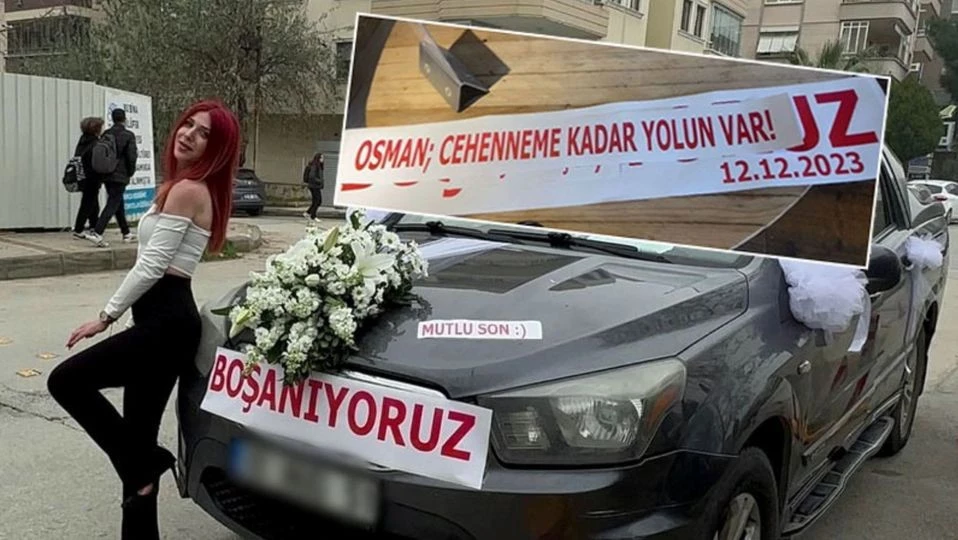 Bursa'da yaşayan 29 yaşındaki Gülşah A., 10 yıllık eşinden boşanmak için dava açtı. Boşanma davasına giderken, aracını gelin arabası gibi süsleyip, üzerine 'Osman cehenneme kadar yolun var' ve 'Boşanıyoruz' yazılarını astı.