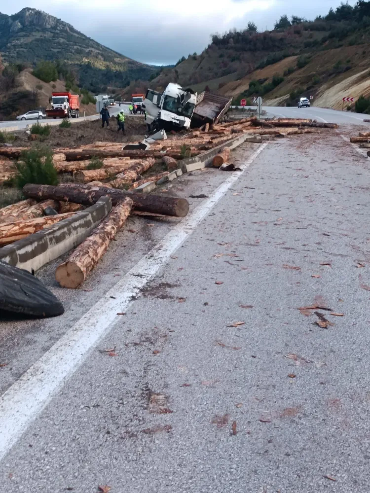 Balıkesir Dursunbey karayolunda meydana gelen kazada tomruk yüklü kamyon yoldan çıktı.
