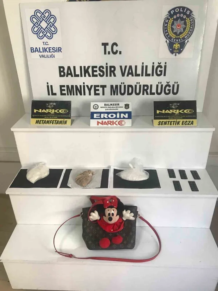 Balıkesir’de uyuşturucu tacirlerine yapılan operasyonda bir kadın polis memurunun dikkatini çeken Mickey Mouse çantası şüphelileri ele verdi.